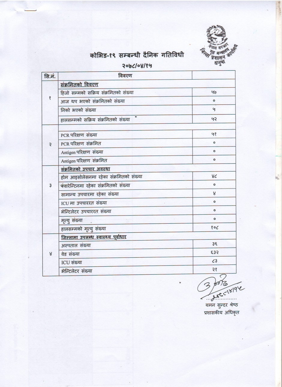 २०७८/०४/१५ काेभिड १९ सम्बन्धी दैनिक गतिविधी
